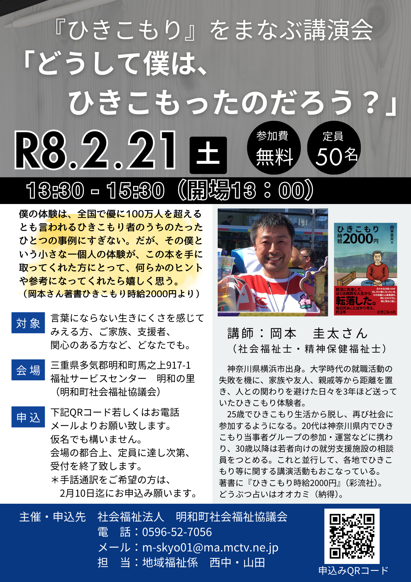 【申込先】 明和町社会福祉協議会地域福祉係 山田・西中 電話 0596-52-7056 申込フォームhttps://docs.google.com/forms/d/e/1FAIpQLSc18o4xOvTxL8YjGZfvMuC2anwc8cHQ5IEF6MQarSrg21ipdQ/viewform |